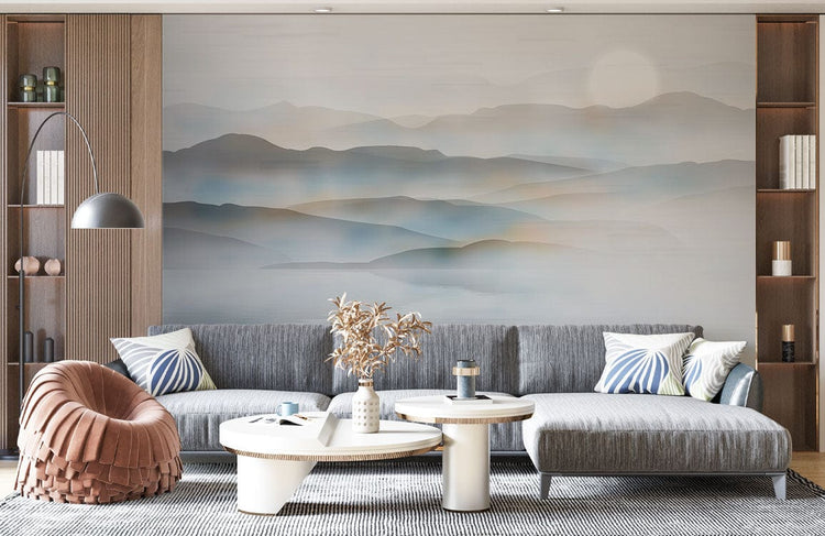 Papier peint mural montagne encre dans un salon moderne avec canapé gris et mur montagne