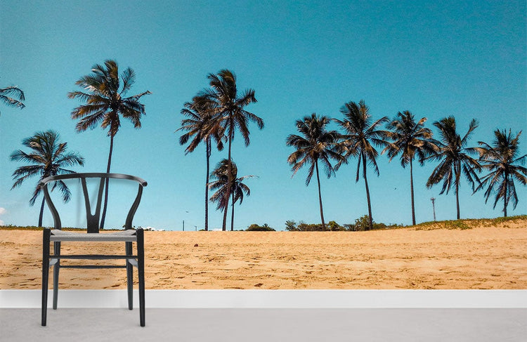 Une rangée de palmiers sur une plage de sable pour le papier peint mural plages