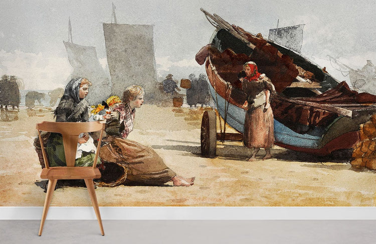 Peinture murale scène de plage avec femmes en tenue traditionnelle et bateaux de pêche