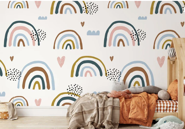 Idéale pour une chambre d’enfant, une salle de jeux, un coin lecture, mais aussi un salon moderne aimant la couleur, la tapisserie arc en ciel se marie aisément à des matières naturelles et un mobilier épuré.