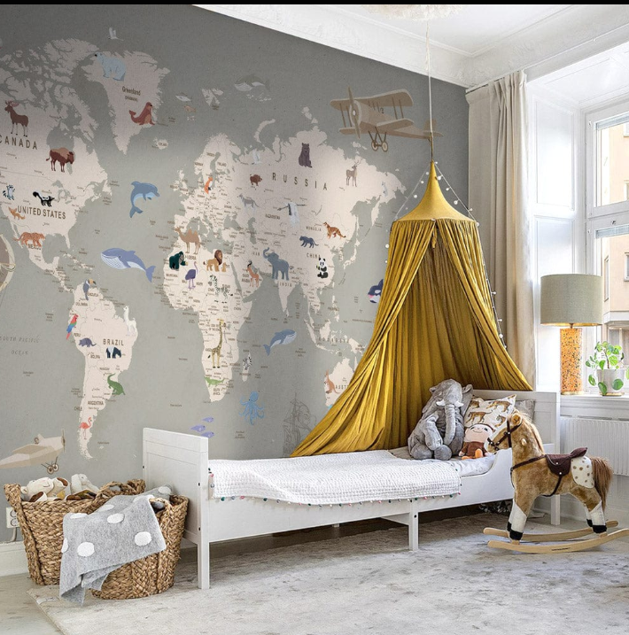 Cartes du monde, abécédaires illustrés, tracés stellaires : ces motifs décorent et encouragent la curiosité. Dans une chambre d’enfant, la juste densité du dessin évite la surcharge visuelle.