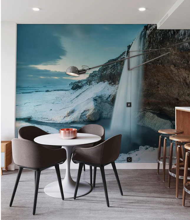 Un papier peint panoramique évoquant une chute d’eau installe une ambiance calme et lumineuse. La présence de l’eau, les brumes légères et la perspective accentuent la sensation de hauteur et de largeur, tout en offrant un décor facile à accorder avec des matières sobres et des palettes neutres.