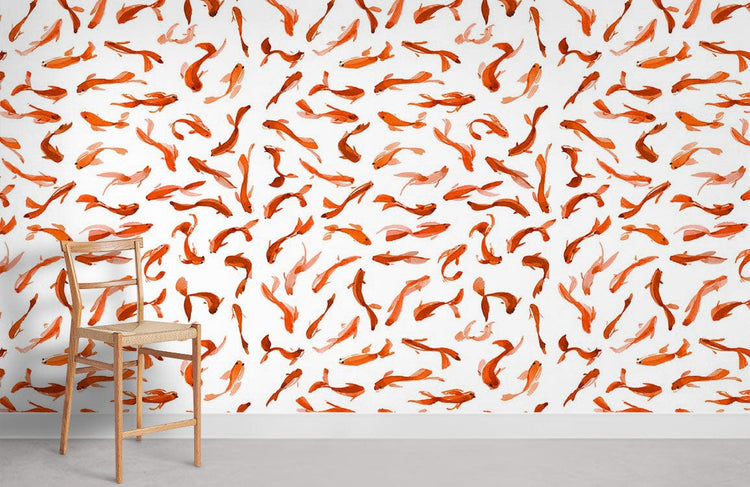 Papier peint mural de poissons rouges avec motif orange sur fond blanc