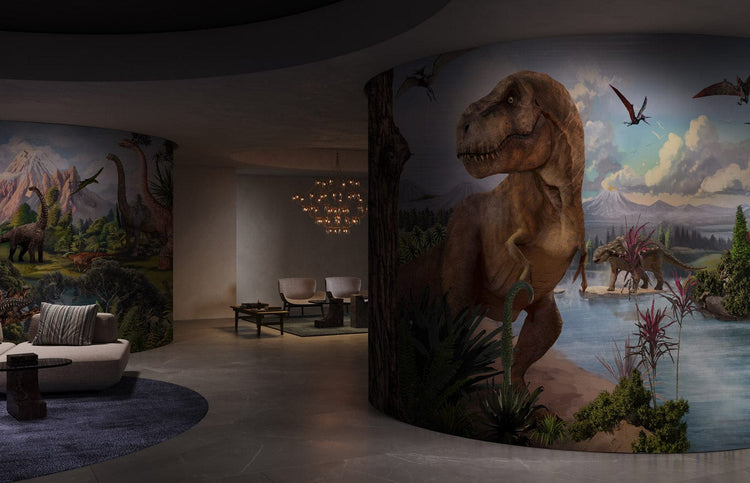 Papier peint panoramique de paysage préhistorique avec dinosaures dans un salon moderne