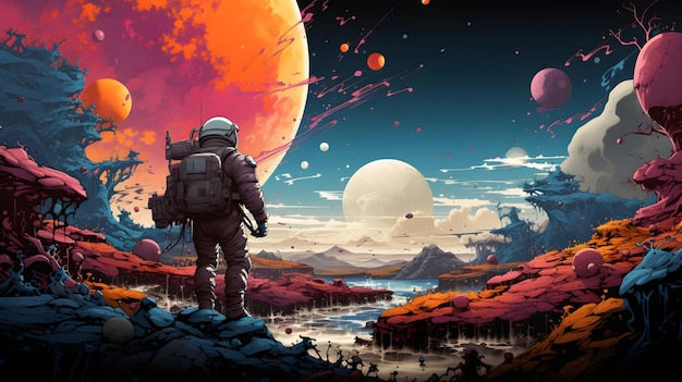 Astronaute en costume spatial avec sac à dos sur papier peint exploration spatiale futuriste
