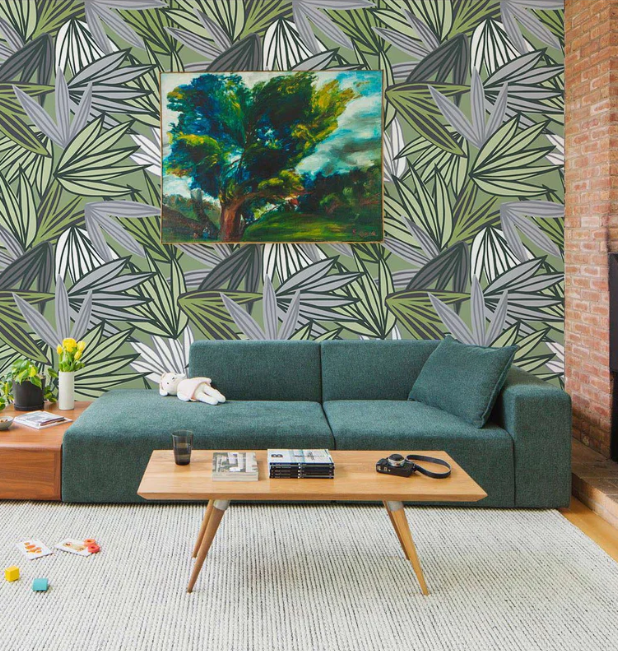 Parce qu’il équilibre motifs amples, couleurs nuancées et design lisible : de grandes feuilles de palmier créent une trame végétale apaisante, tandis que des feuilles plus fines structurent le regard et donnent une atmosphere zen. En un seul mur, un papier peint bien pensé suffit à cadrer l’espace.