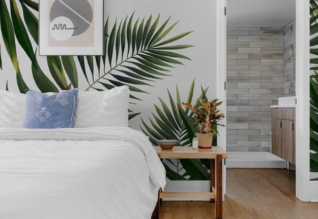 - Chambre : papier peint palmier beige ou vert sauge ; textiles écrus pour une atmosphere calme.