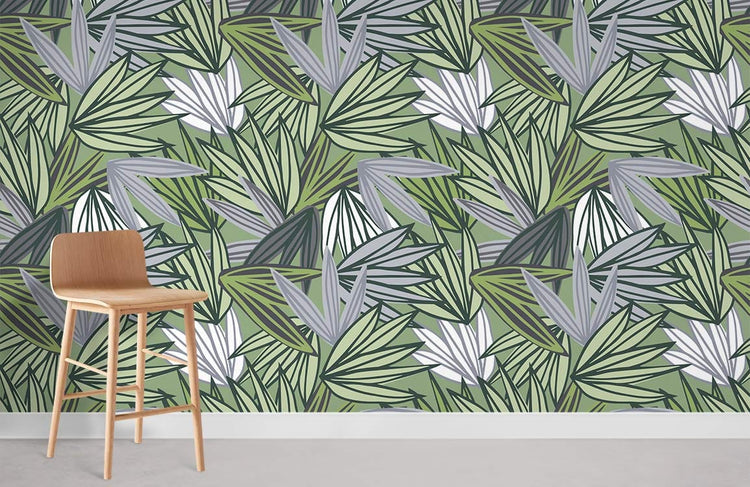 Papier peint mural motif feuilles de palmier avec feuilles tropicales vert, gris et blanc