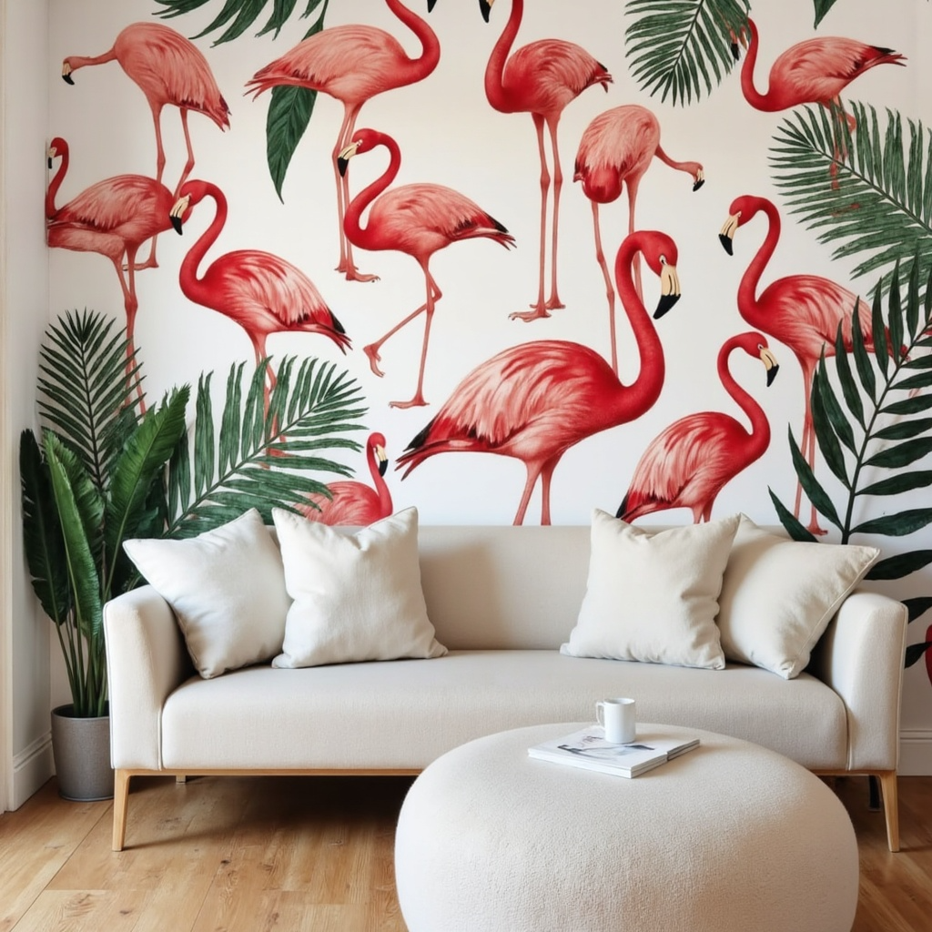 Élancé, graphique, le flamant instaure une ambiance chic et dépaysante. En aquarelle pour un rendu doux, en tracés geometrique minimalistes ou en trompe-l’œil réaliste (parfois abrégé en « trompe-l’ »), il se prête à toutes les conceptions. Les motifs peuvent mêler fleurs, feuilles tropicales, plumes et perroquets pour une scène vivante d’oiseaux tropicaux.