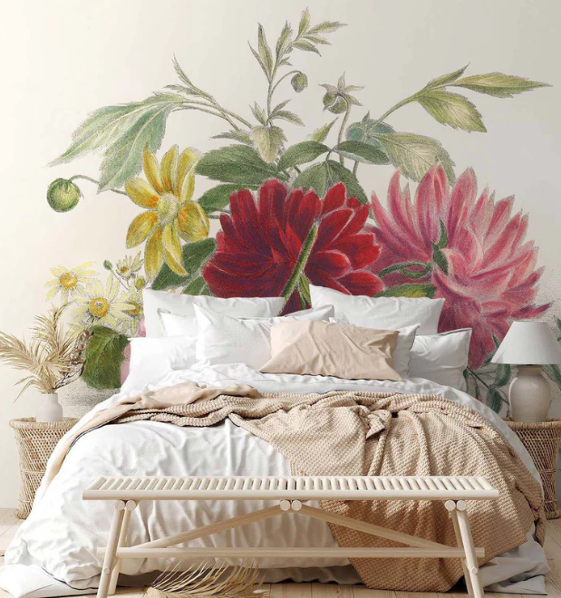 - Chambre : en tête de lit, choisissez une fleur centrale (pivoine, rose, magnolia) pour un effet apaisant.