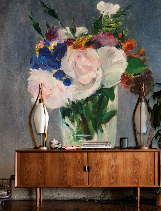 Un bouquet XXL se marie parfaitement avec du bois clair, du lin lavé, des céramiques mates et un laiton très discret. Évitez de multiplier les graphismes concurrentiels sur les autres murs ; si vous voulez un contrepoint végétal plus fin, orientez-vous vers des feuilles stylisées ou des herbiers poétiques.