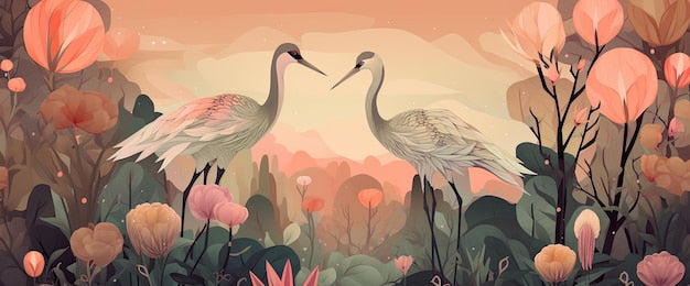 Papier peint avec deux grues élégantes et lotus roses dans un paysage stylisé