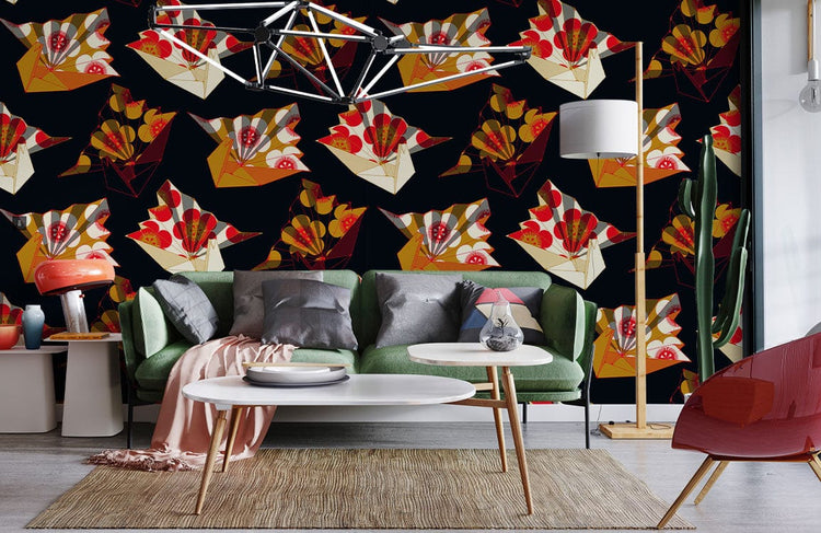Papier peint mural avec motif de grues japonaises colorées sur fond noir