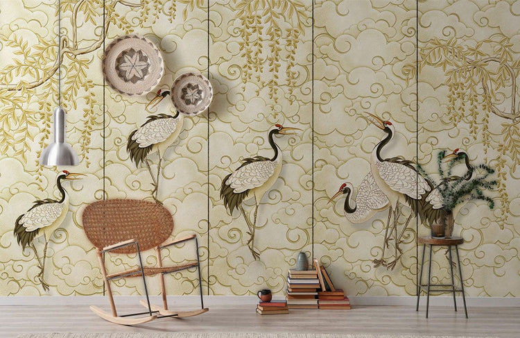 Papier peint mural grues avec nuages et feuillage suspendu pour décoration intérieure