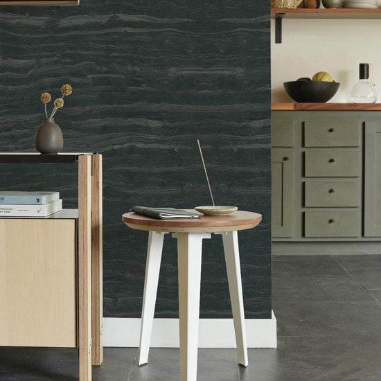 Table d’appoint ronde en bois avec pieds blancs sur papier peint mural effet tableau noir