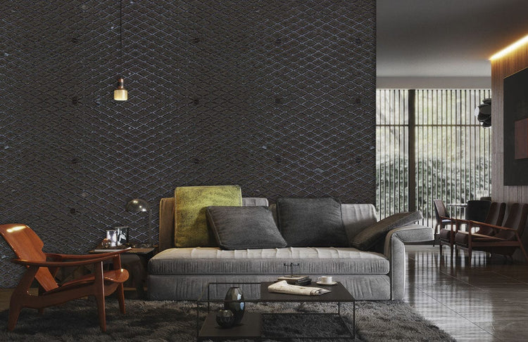 Papier peint mural en treillis métallique avec motif diamant sombre gris foncé