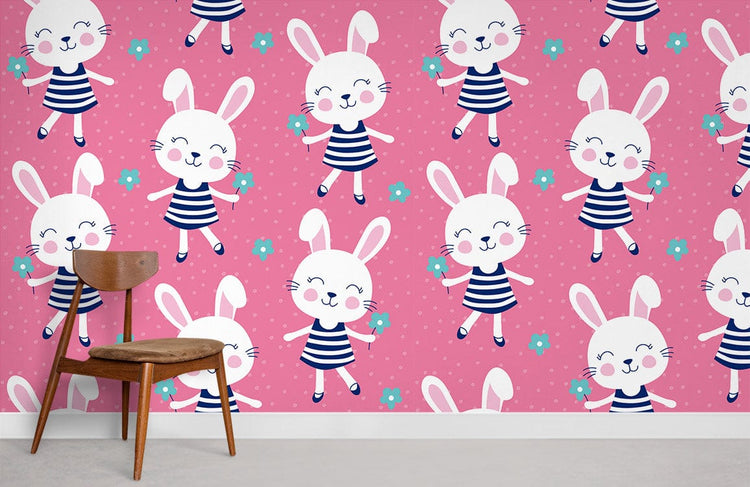 Mural Happy Bunny papier peint mural rose et lapins blancs enchantés