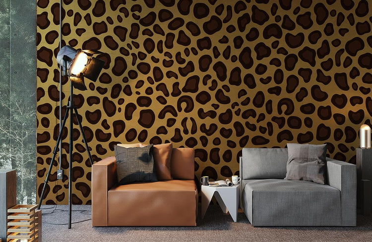 Papier peint artistique motif léopard dans un salon moderne avec canapé marron et lampe