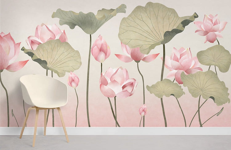Papier peint mural Fleur de Lotus avec fleurs de lotus roses et feuilles sur fond dégradé