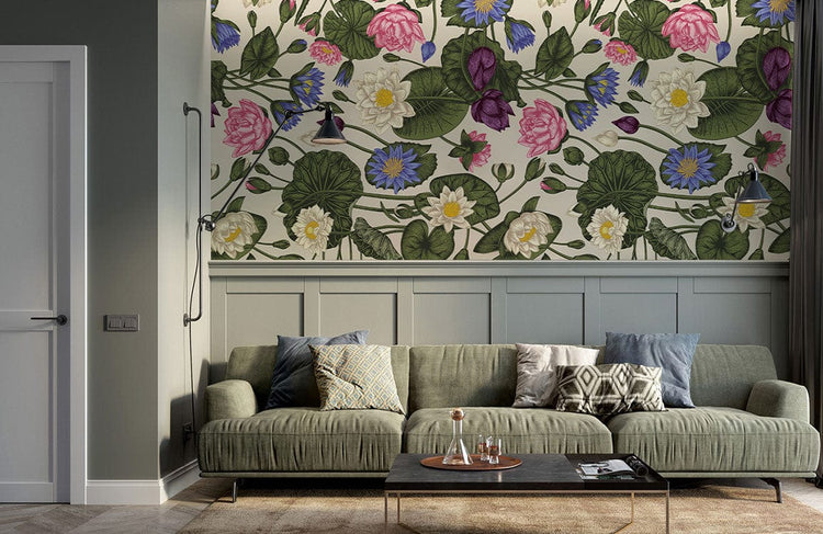 Papier peint mural moderne avec motif floral vibrant dans un salon avec canapé vert foncé
