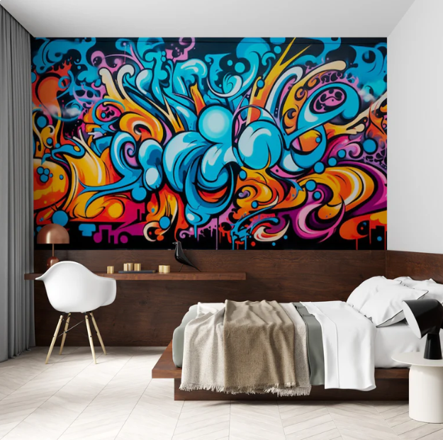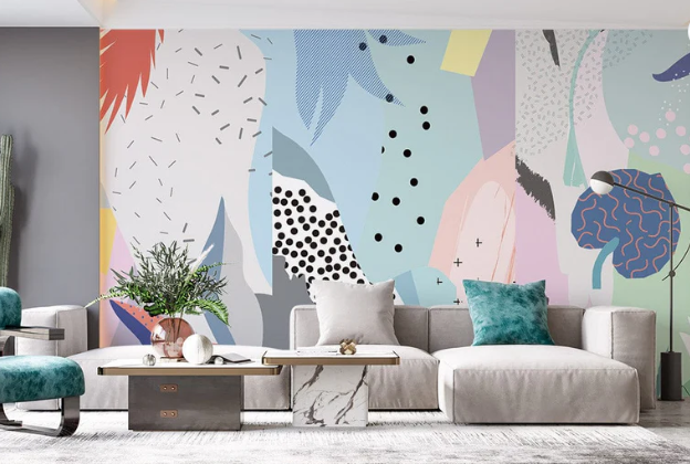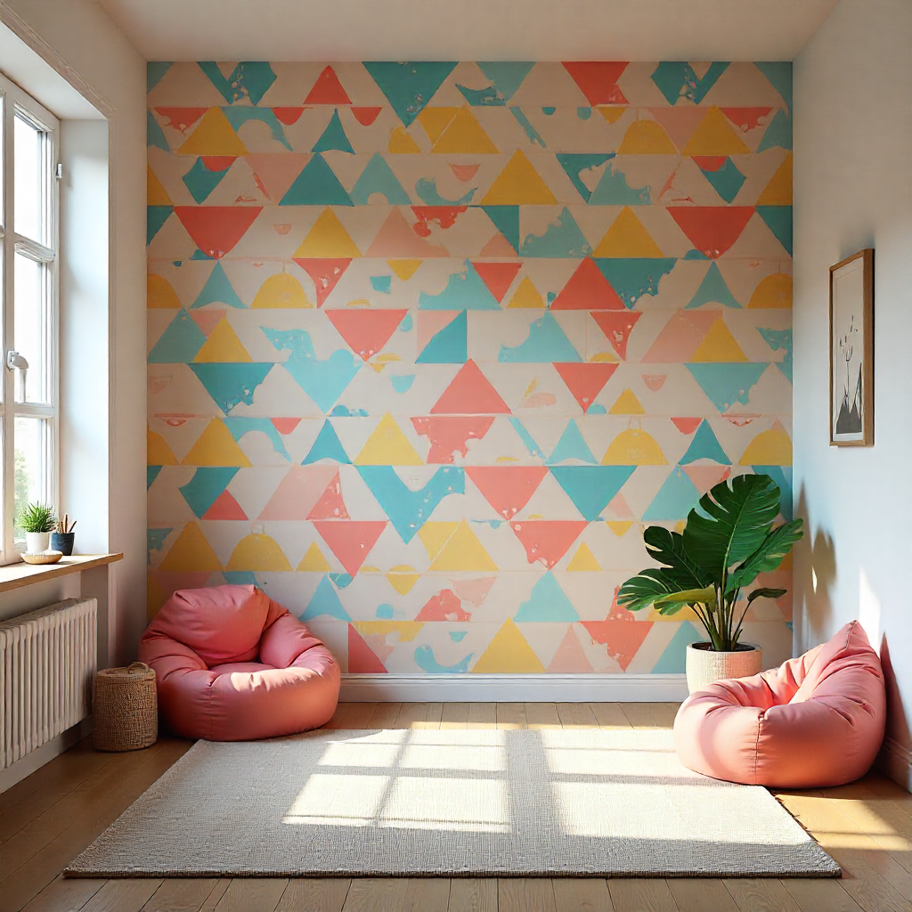 Des formes géométriques multicolores, des lignes répétées ou des chevrons colorés créent une ambiance contemporaine et structurée. Parfait dans un bureau ou un couloir pour apporter du rythme.
