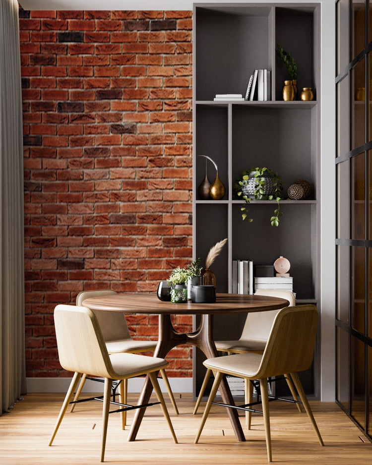 Table en bois rond avec chaises beiges, idéal pour papier peint imitation briques rouges