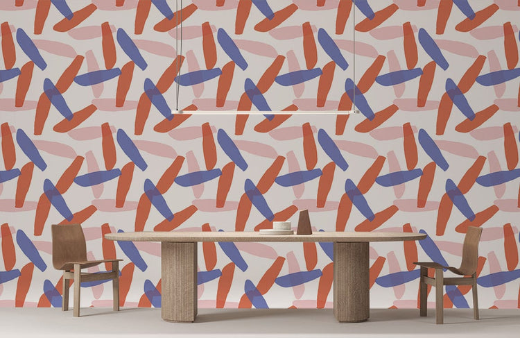 Papier peint aux motifs avec pinceaux abstraits vibrants en rouge, bleu et rose pâle