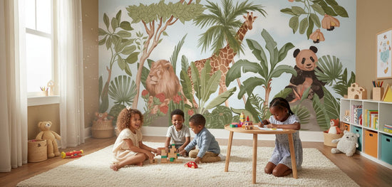 Enfants jouant avec jouets devant un papier peint animaux tropicaux chez Mr Papier