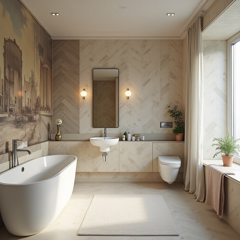 Privilégiez des designs rythmés, faciles à coordonner avec faïence et robinetterie. Les motifs géométriques beige , gris ou bleu doux sont ideal pour un rendu net et lumineux.