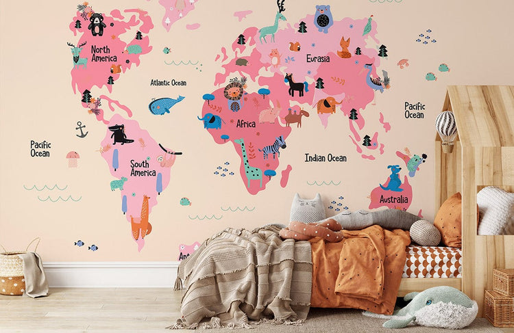 Décor mural enfant avec animaux roses, papier peint mural carte des animaux