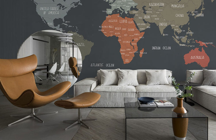 Papier peint mural moderne avec carte du pays obscur dans un salon contemporain