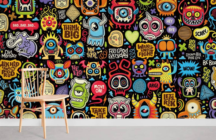 Papier peint mural de monstres drôles doodle ll dans une chambre colorée avec mur d’accent