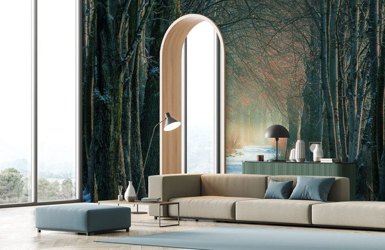 Papier peint panoramique d’un chemin enneigé dans les bois, décoration murale nature