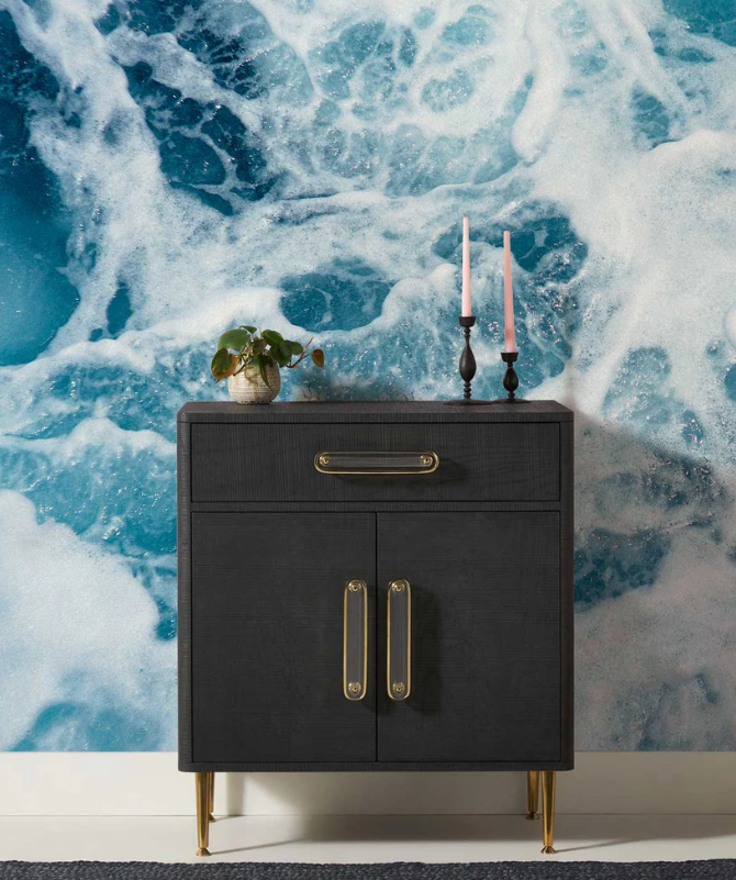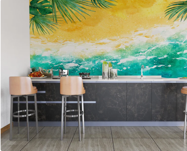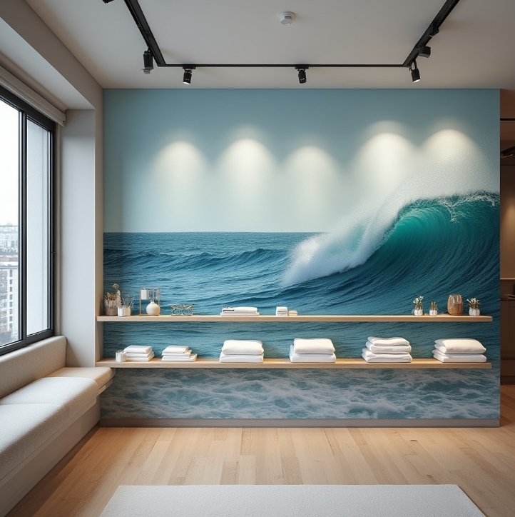 Un papier peint panoramique posé derrière le canapé crée un horizon continu. Dans une chambre, placez le décor derrière la tête de lit pour élargir la perspective. Dans un couloir, une scène de vagues dirige naturellement le regard et fluidifie la circulation.