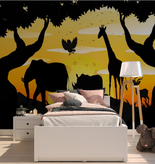Commencez par un papier peint panoramique savane, ajoutez une dose de rose ou de noir & blanc, et laissez la magie opérer.