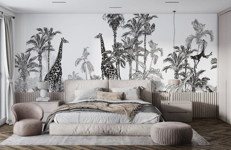 Peinture murale aventure jungle exotique safari avec girafes et palmiers en noir et blanc