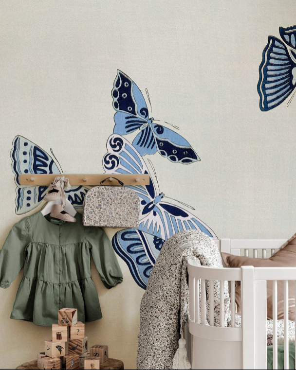 Ces univers se marient naturellement avec un décor papillon : un mur principal animé par un motif aérien, puis des rappels colorés et des textures complémentaires. L’ensemble compose une décoration cohérente, élégante et facile à vivre au quotidien.