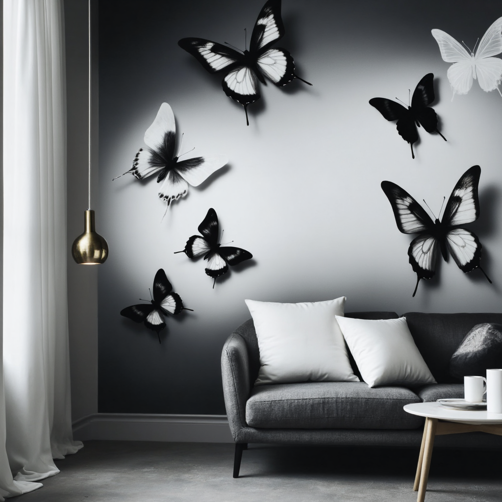 Pour un esprit plus design, les papillons stylisés en noir et blanc, gris ou crème offrent un graphisme net et un relief subtil. Ils conviennent parfaitement aux intérieurs contemporains et aux amateurs d’ambiances minimalistes.