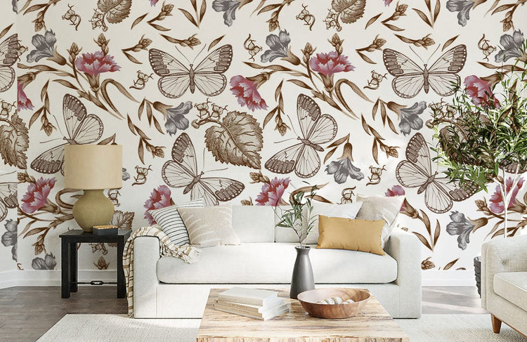 Papier peint mural avec motif de papillons, fleurs et feuilles pour une déco nature