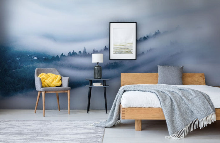 Murale de Papier Peint des Nuages aux Forêts dans une chambre avec lit en bois