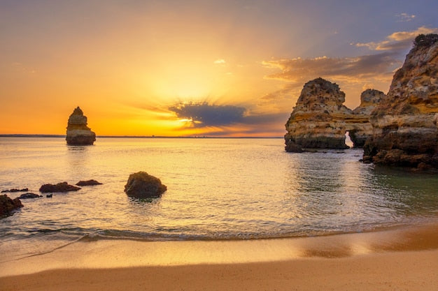 Papier peint réveil tropical avec plage dorée, falaises et coucher de soleil vibrant