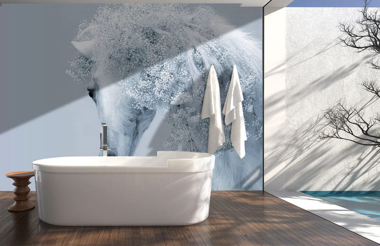 Papier peint unique avec un cheval blanc et une crinière florale pour décoration intérieure
