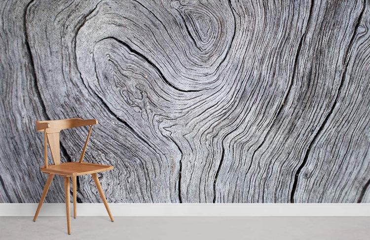 Papier peint mural à motif de bois gris avec grain texturé et motifs swirlés