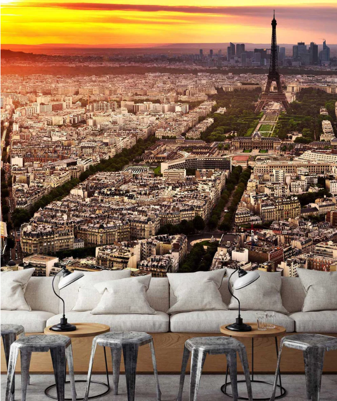 - Paris : un papier peint ville aux toits haussmanniens pour une touche romantique et un style intemporel.