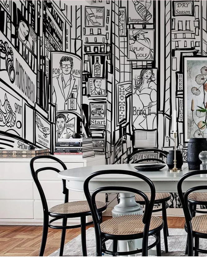 - Noir et blanc : le papier peint graphique par excellence. Les contrastes forts subliment l’architecture et se marient avec un mobilier urbain sobre.