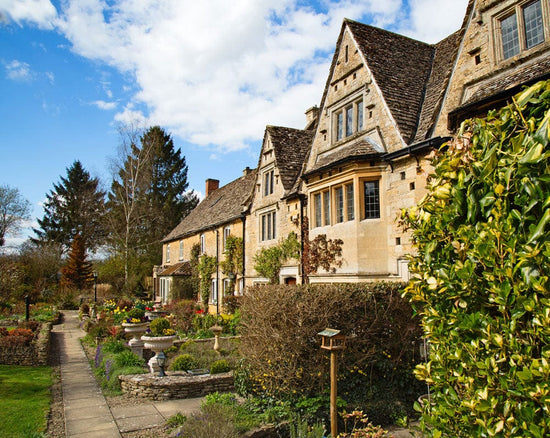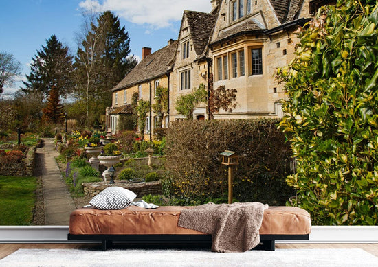 Murale de Papier Peint Ville Florale montrant maisons en pierre avec jardins et chemin pavé