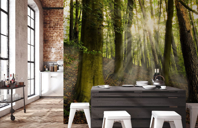 Papier peint mural de bois verts avec lumière du soleil filtrant dans la forêt dense