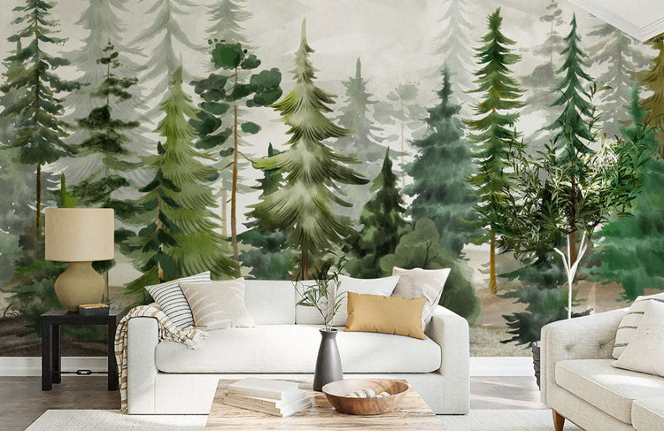 Peinture murale de forêt de pins à l’aquarelle, idéal pour papier peint panoramique sur mesure