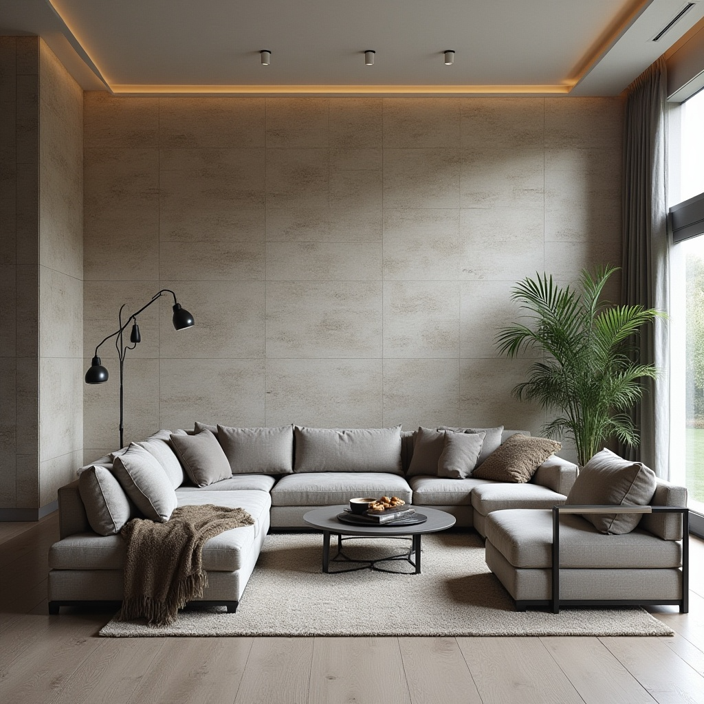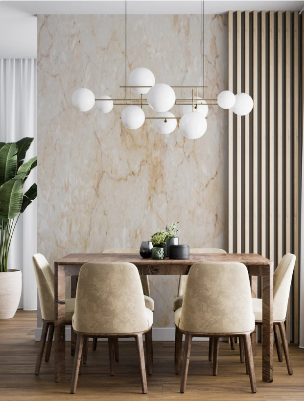 Ce papier peint réchauffe visuellement et convient aux pièces de vie. Un papier peint beige ou gris clair convient bien à une lumière douce.