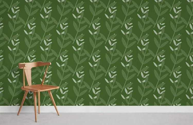 Papier peint mural à feuilles vert foncé avec motif de branches vertes claires et foncées